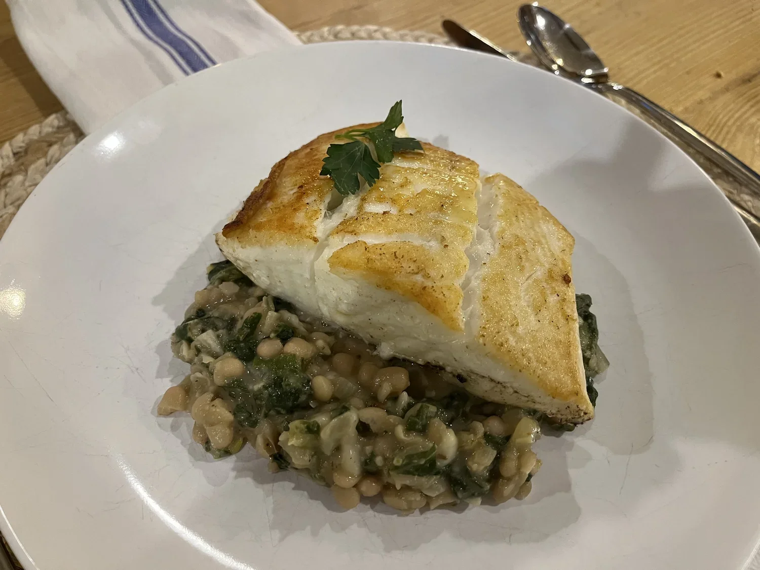 Plate the White Beans with Swiss Chard and Parmesan and place the Halibut on top.